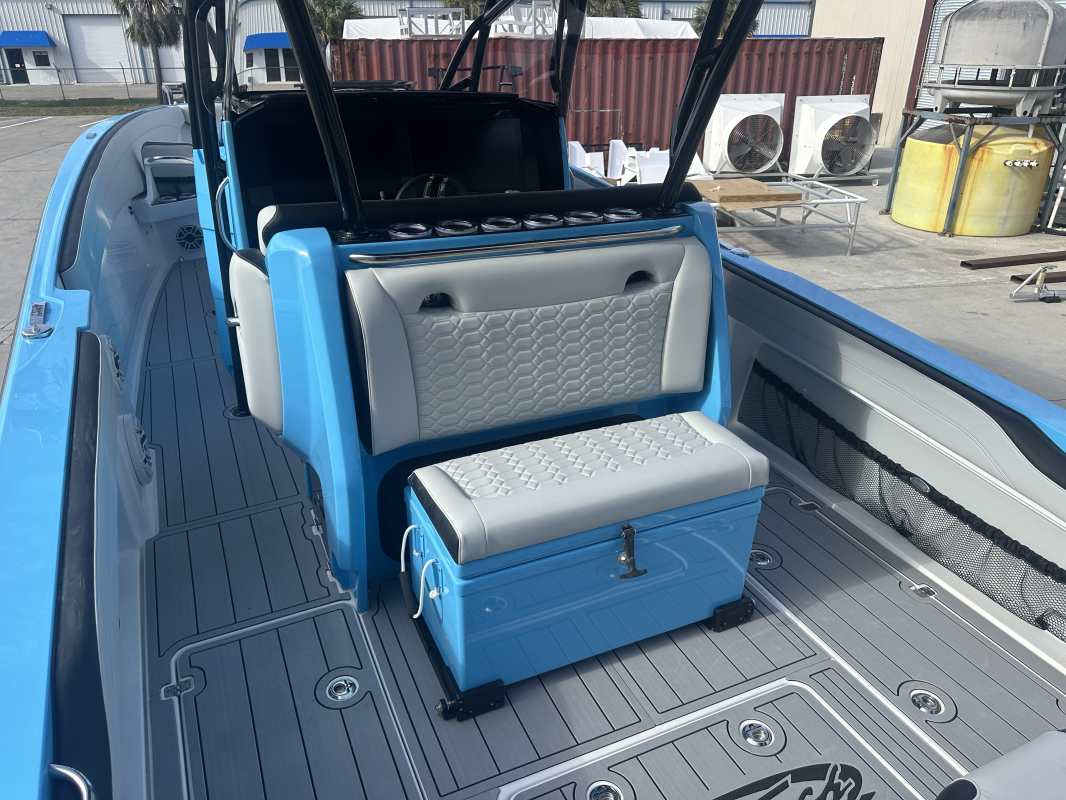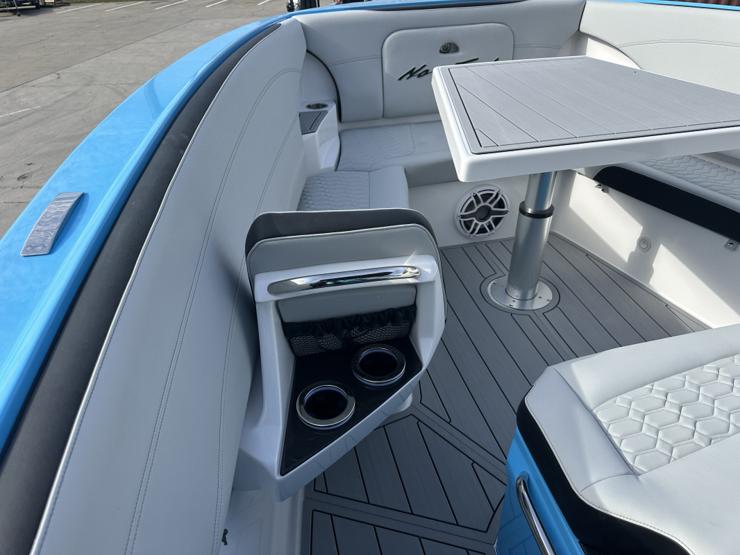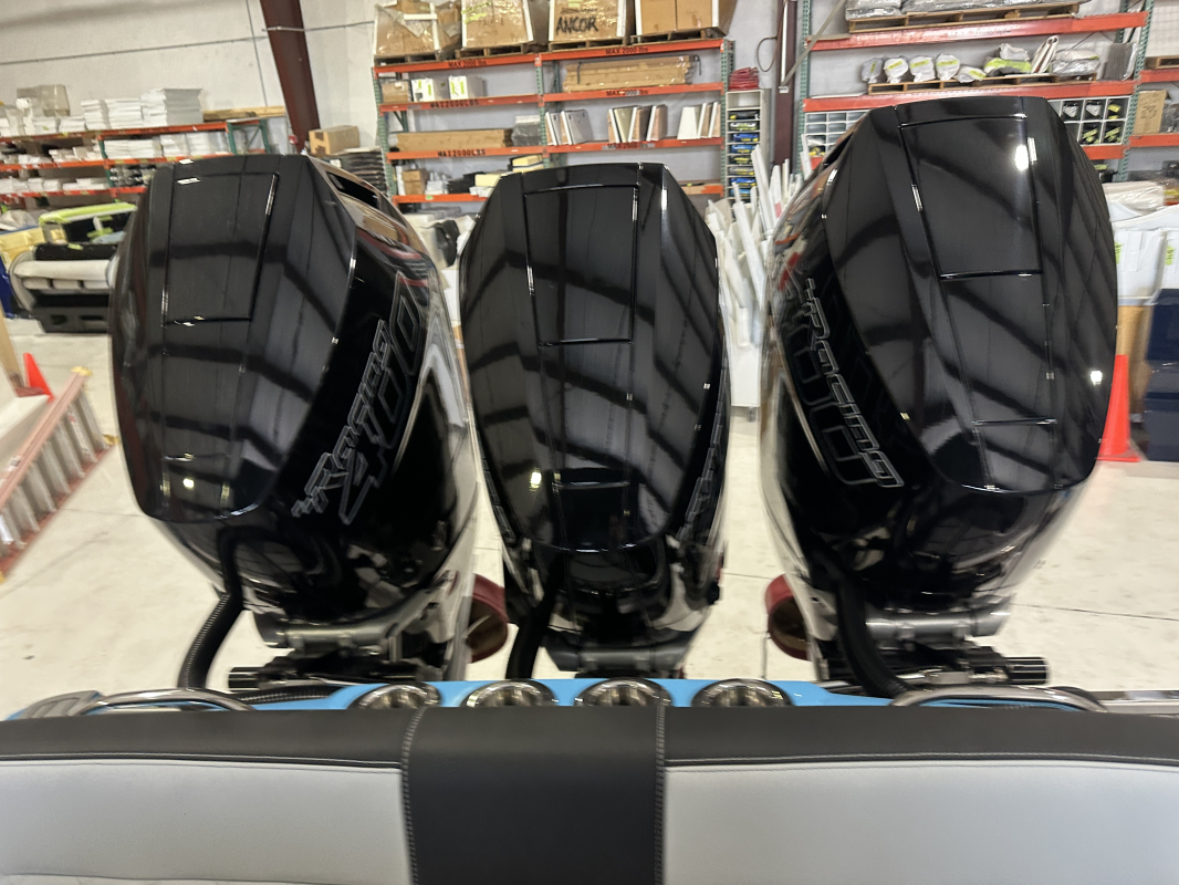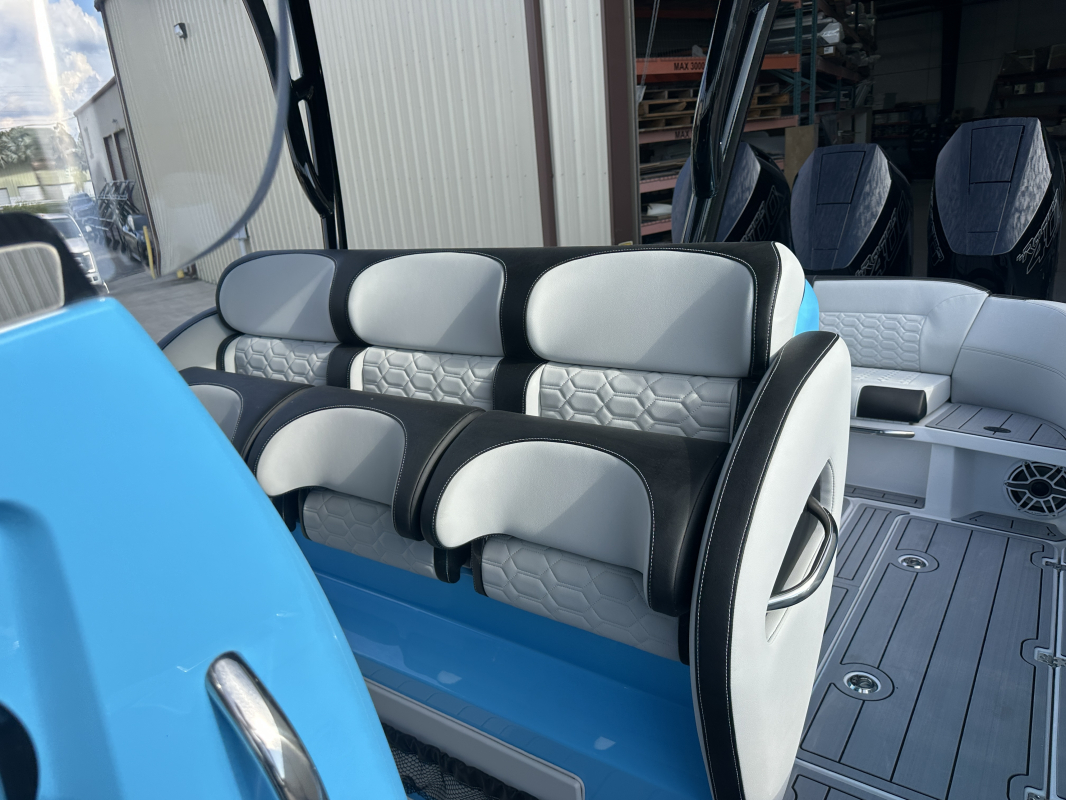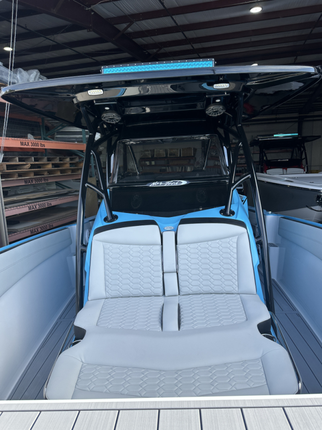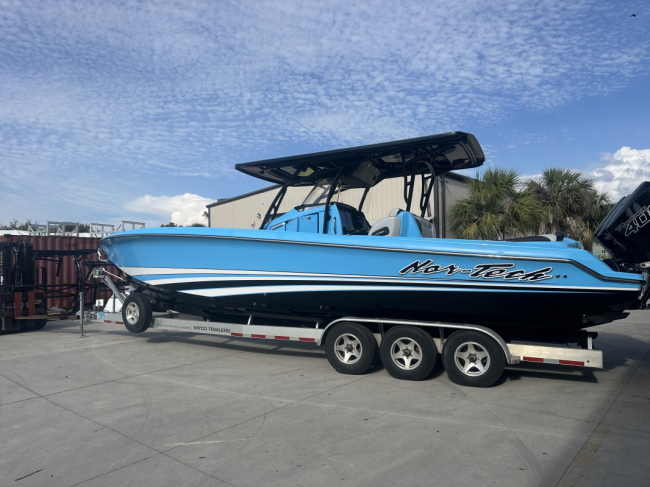 2025 Nor-Tech 340 Sport. Powered by triple Mercury Racing 400R V10's. Big option list including Zero Effort Controls, Club Sport rear bench, twin Garmin 8622 GPS, Big JL Audio stereo, VHF, transducer, bow thruster, big paint upgrades, largest available all JL audio sound system including backlit speakers, Sea Dek, Black Oak LED light bar, fresh water flush, flush toilet/macerator, retractible boarding ladder, windlass, electric bow table/lounge, Sea-Dek, forward facing backrests in bow, hexagon interior, large t-top and much more. The black gel bottom with the Lamborghini Urus blue paint makes this one a showstopper. Only $632,400 USD.