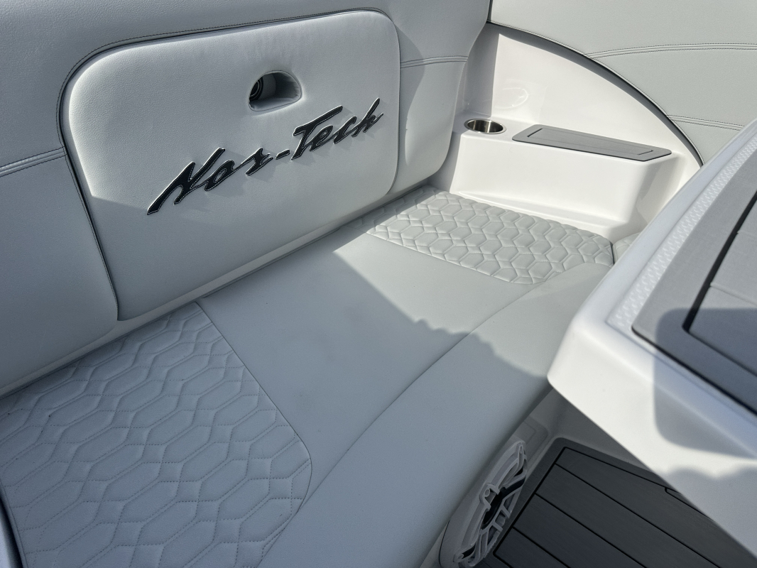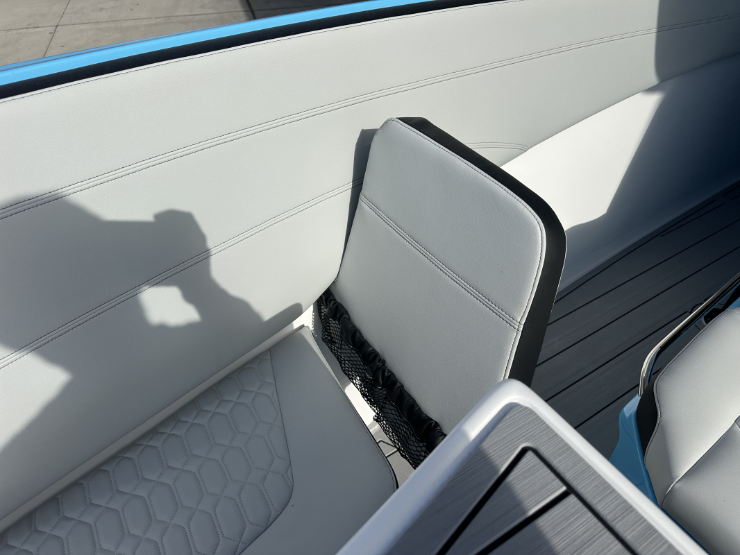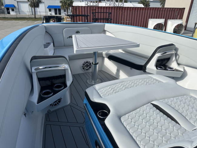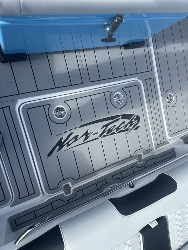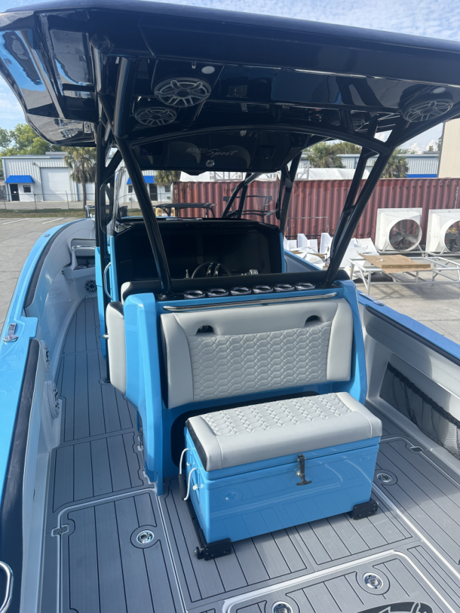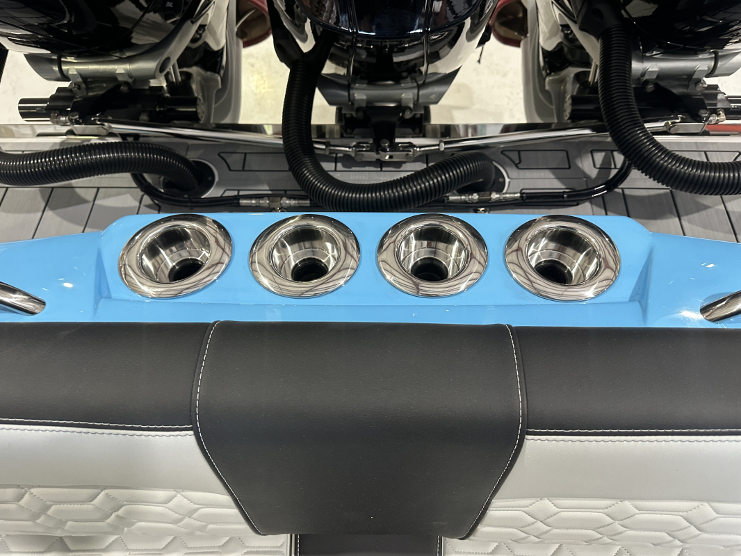 2025 Nor-Tech 340 Sport. Powered by triple Mercury Racing 400R V10's. Big option list including Zero Effort Controls, Club Sport rear bench, twin Garmin 8622 GPS, Big JL Audio stereo, VHF, transducer, bow thruster, big paint upgrades, largest available all JL audio sound system including backlit speakers, Sea Dek, Black Oak LED light bar, fresh water flush, flush toilet/macerator, retractible boarding ladder, windlass, electric bow table/lounge, Sea-Dek, forward facing backrests in bow, hexagon interior, large t-top and much more. The black gel bottom with the Lamborghini Urus blue paint makes this one a showstopper. Only $632,400 USD.