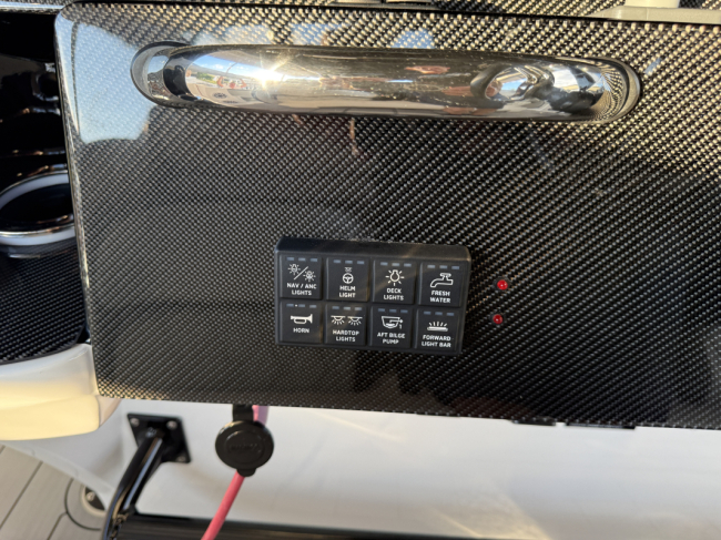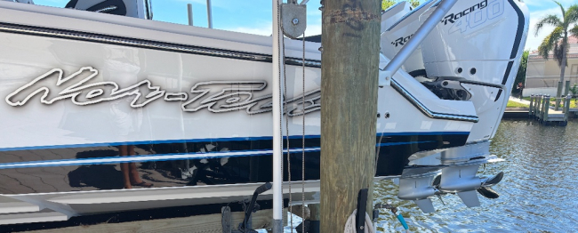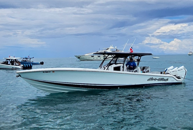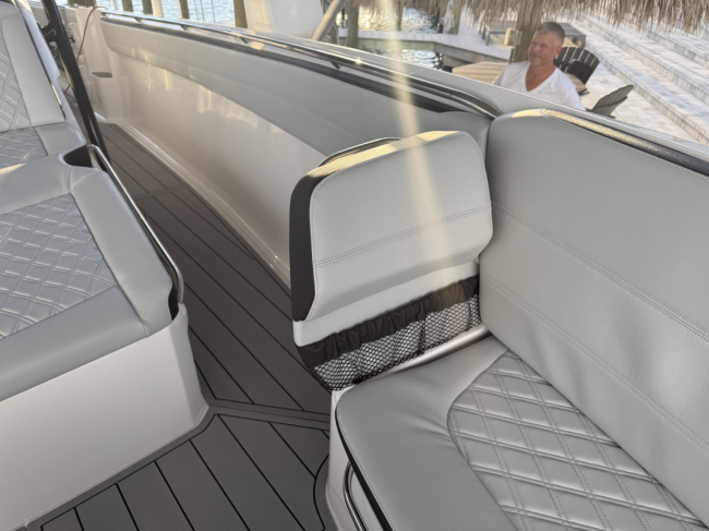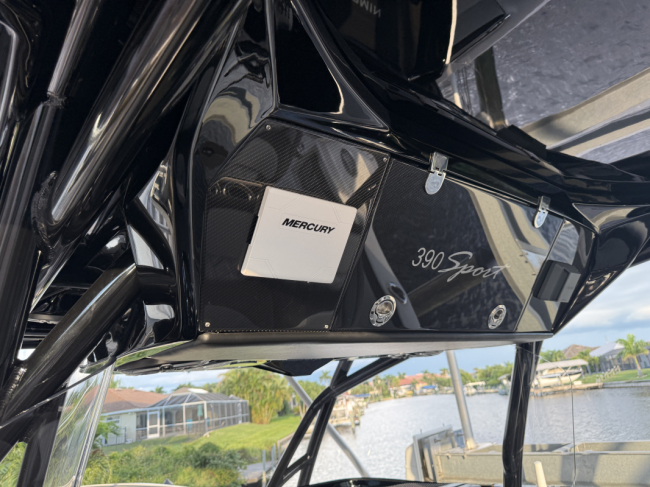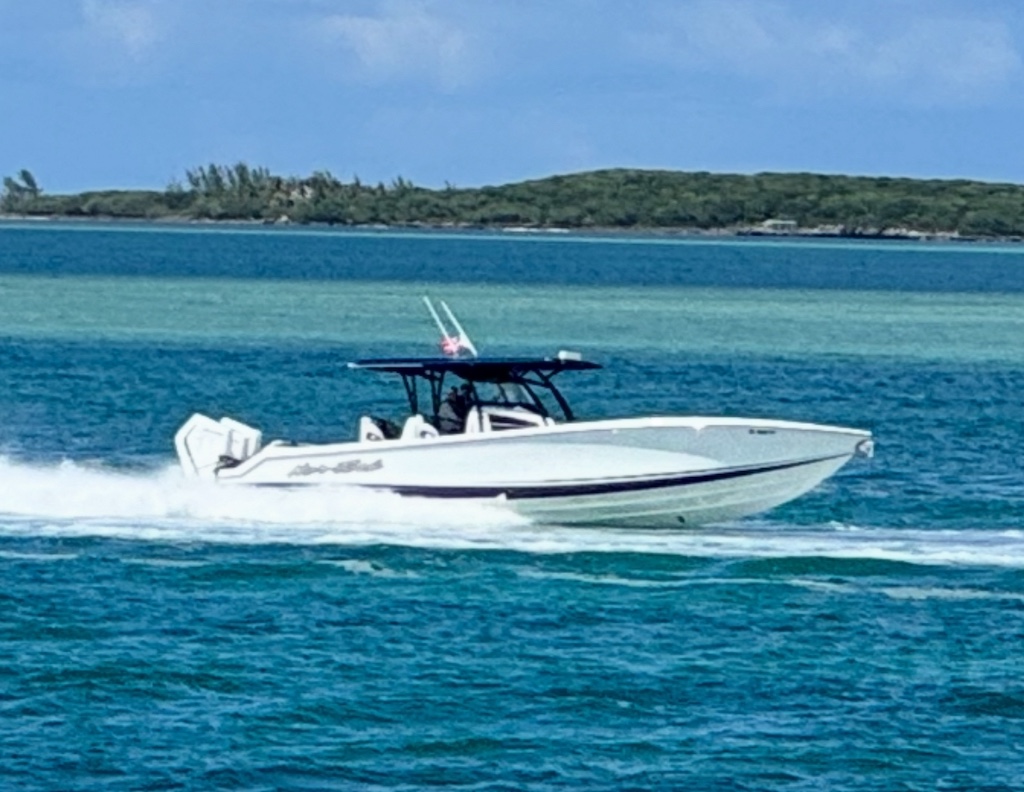 2025 Nor-Tech 390 Sport: MINT and powered by triple Mercury Racing 400R V10. Super tasteful paint and art package, second row bolster, twin 22" Garmins, Reverso automatic fresh water flush, Coast Key key fob and remote start, Black Oak LED 30" bar, big JL Audio sound system, Lumishore underwater lights, transducer, Windlass, flush toilet and berth in cabin, telescoping dive ladder, electric bow table, Club Sport rear bench, 2nd row seating, SureShade, Sea Dek floor, Isotta steering wheel, Sea Dek helm pad and more.