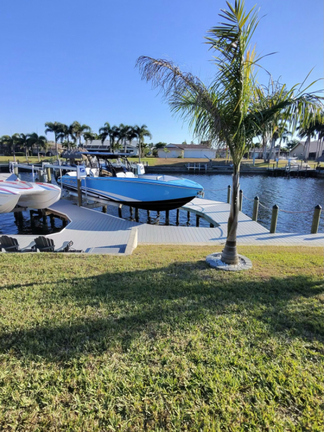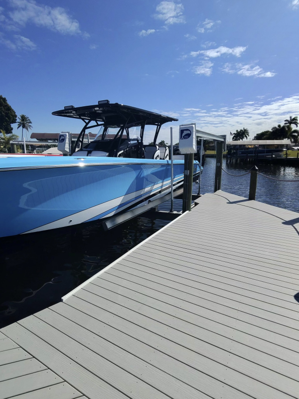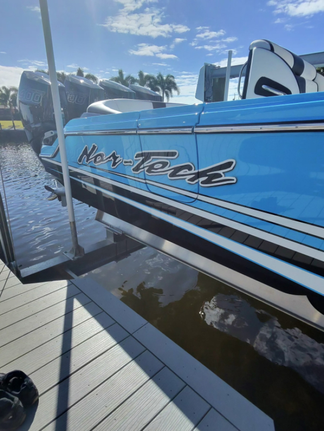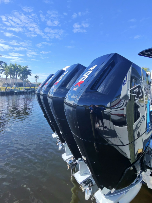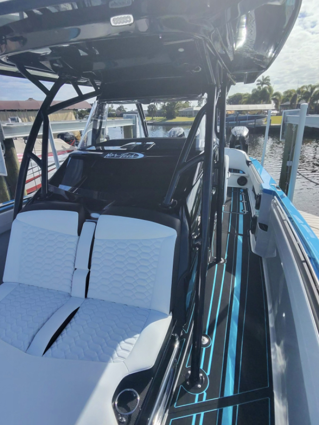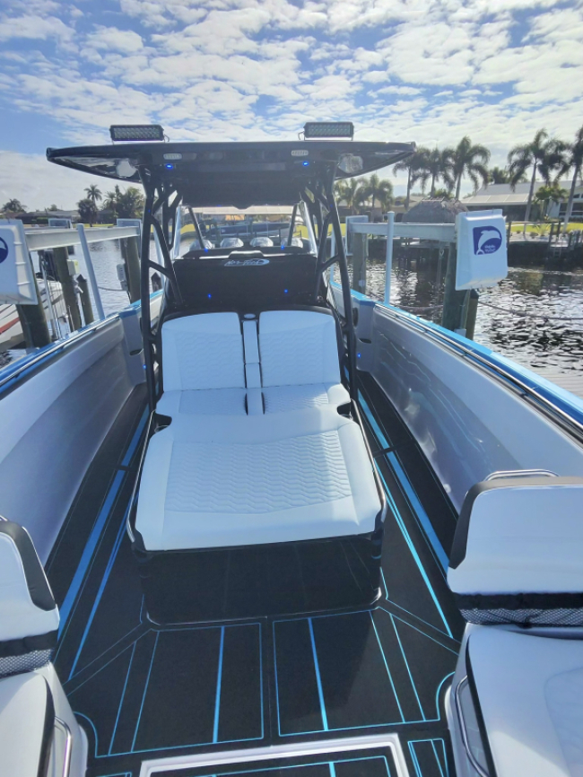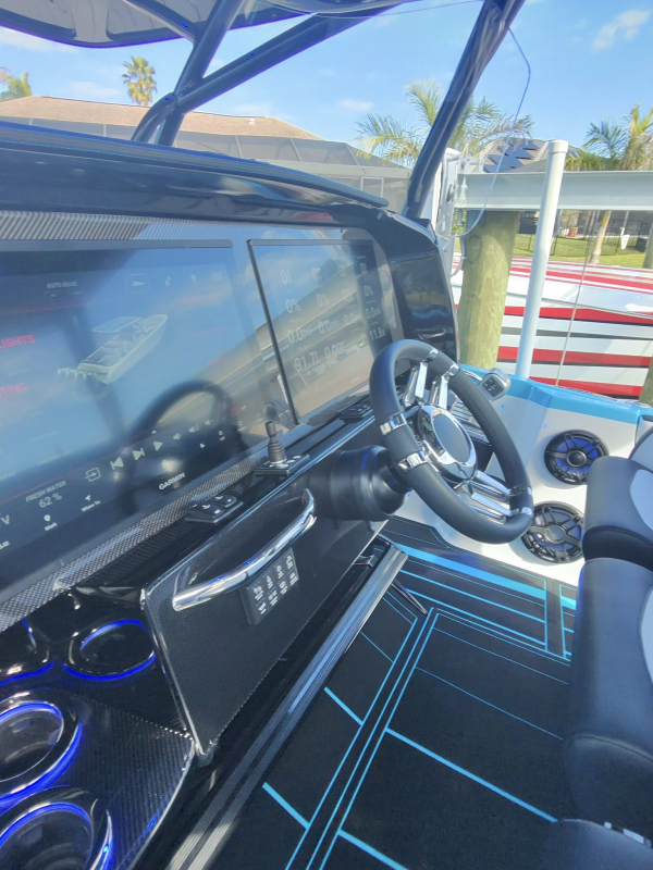Lamborghini blue calendar boat! Powered by quad Mercury Racing 400R. Zero-effort throttles, fresh water flush, twin Garmin 9222, Black Oak LED light bar, underwater lights, huge JL Audio stereo, radar, VHF, bow thruster, second row seating with storage, Club Sport rear bench, Sea Dek, forward facing backrests, custom paint, Coast Key automatic start and battery switches and much more.