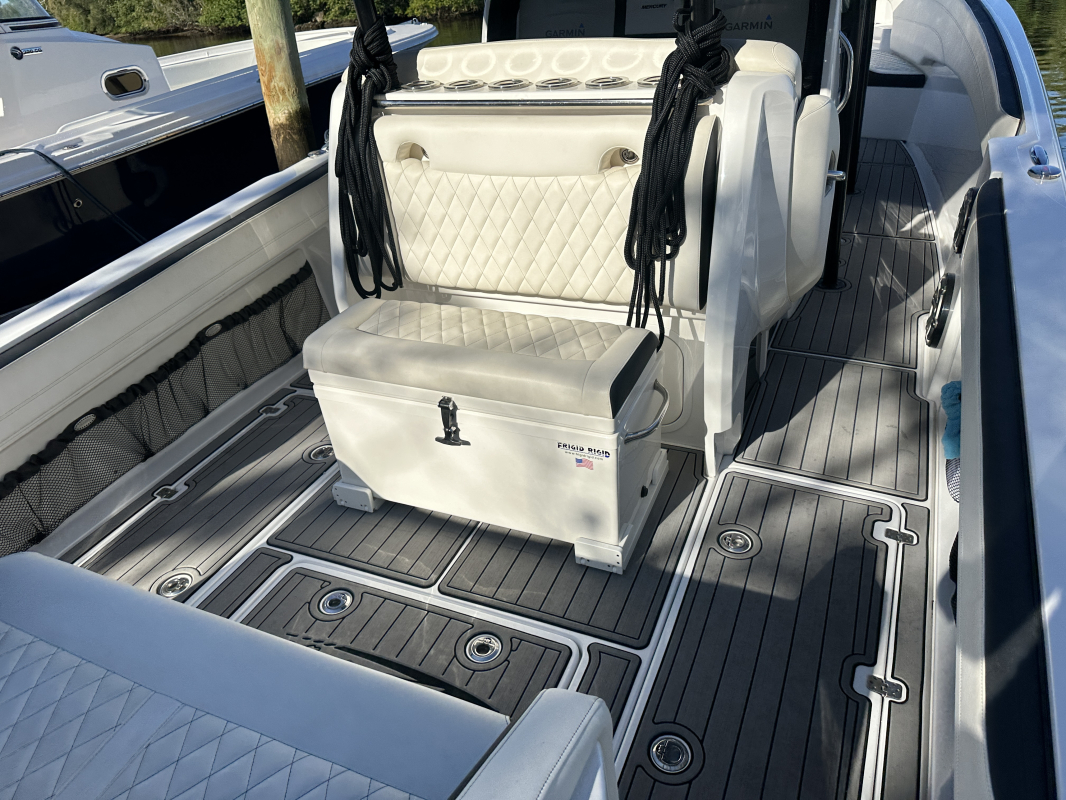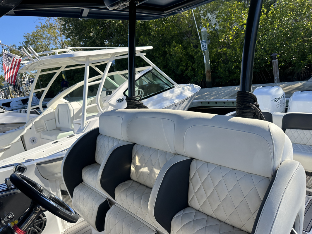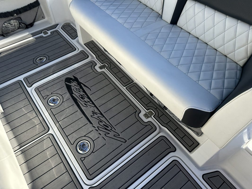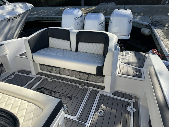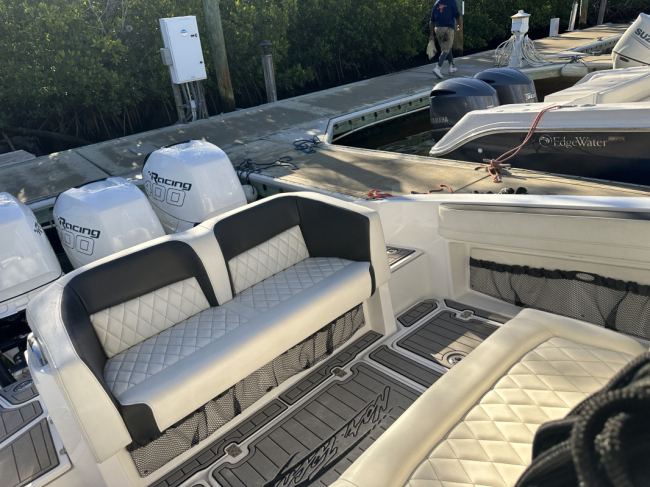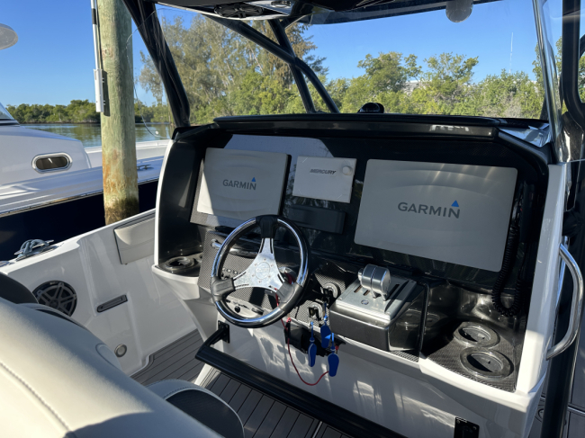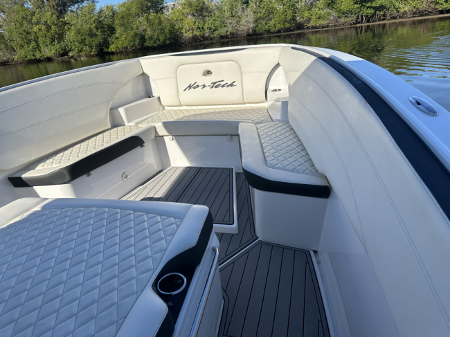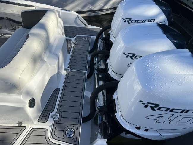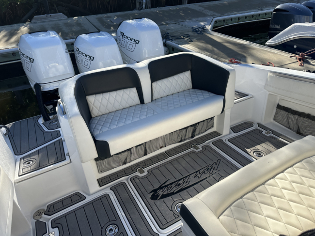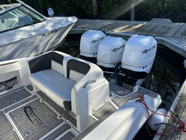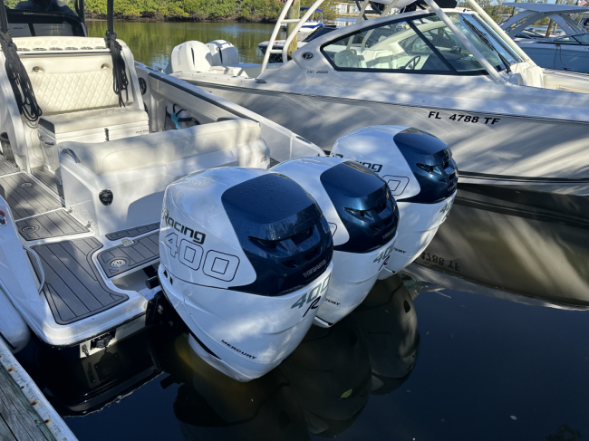 2018 Nor-Tech 340 Sport: Clean boat powered by custom painted triple Mercury Racing 400 R's with only 260 hours. Big option list includes diamond stitched interior, Sea Dek, big stereo, sliding cooler, large t-top, bow thruster, FLIR, bow shade, bow table/sun lounge and much more. Stored indoors since new. Great affordable opportunity to get into Nor-Tech.