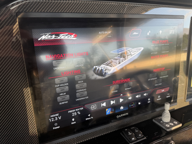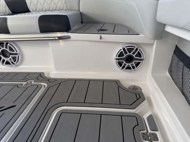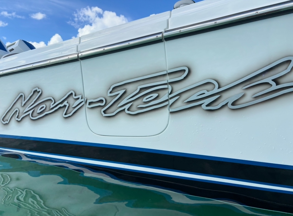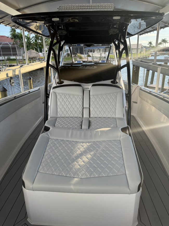 2025 Nor-Tech 390 Sport: MINT and powered by triple Mercury Racing 400R V10. Super tasteful paint and art package, second row bolster, twin 22" Garmins, Reverso automatic fresh water flush, Coast Key key fob and remote start, Black Oak LED 30" bar, big JL Audio sound system, Lumishore underwater lights, transducer, Windlass, flush toilet and berth in cabin, telescoping dive ladder, electric bow table, Club Sport rear bench, 2nd row seating, SureShade, Sea Dek floor, Isotta steering wheel, Sea Dek helm pad and more.