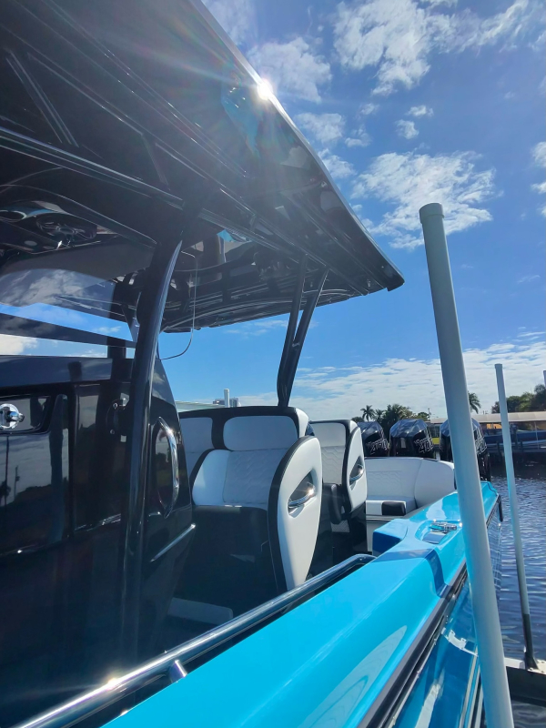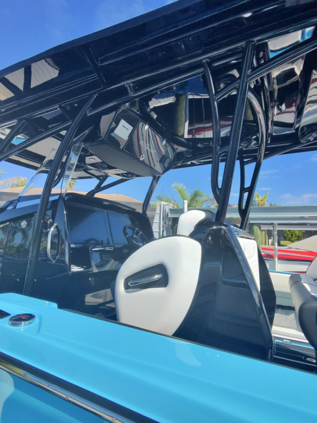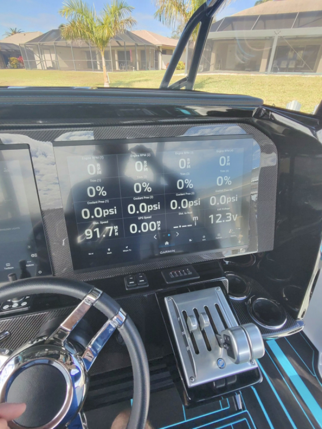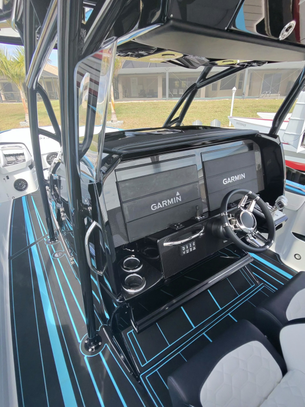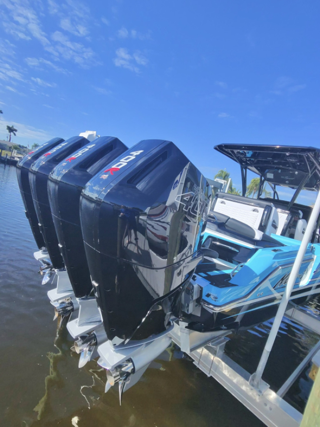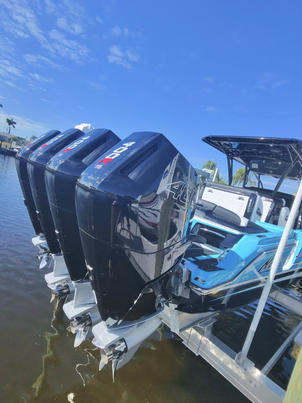 Lamborghini blue calendar boat! Powered by quad Mercury Racing 400R. Zero-effort throttles, fresh water flush, twin Garmin 9222, Black Oak LED light bar, underwater lights, huge JL Audio stereo, radar, VHF, bow thruster, second row seating with storage, Club Sport rear bench, Sea Dek, forward facing backrests, custom paint, Coast Key automatic start and battery switches and much more.